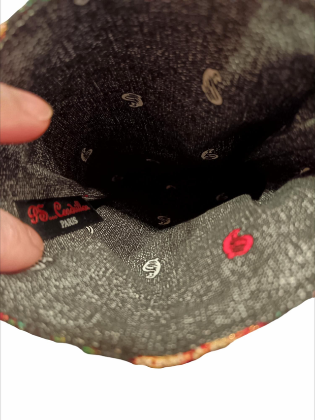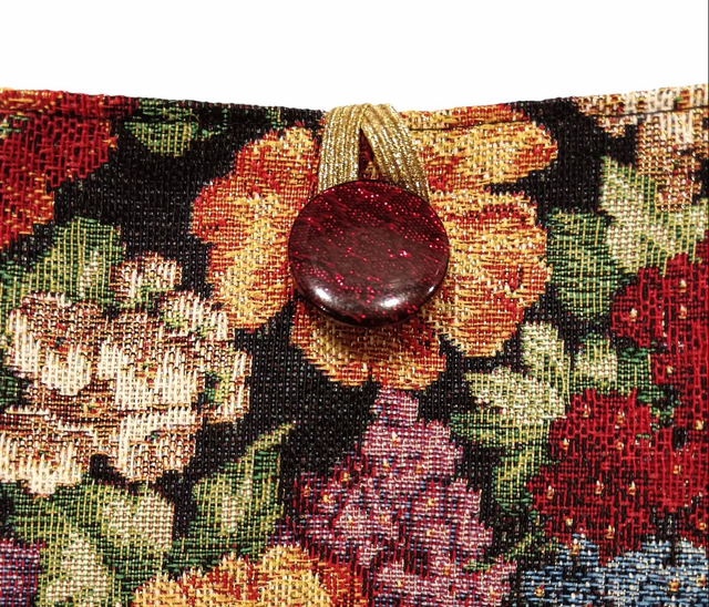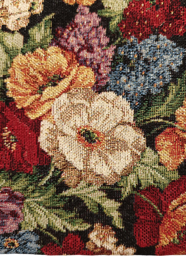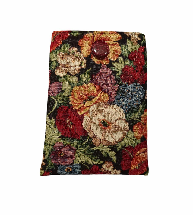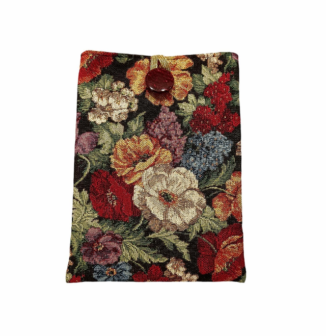 Etui à livre de poche en toile tapissier épaisse, un jacquard Gobelin à motifs de fleurs multicolores sur fond noir avec un petit fil Lurex doré.