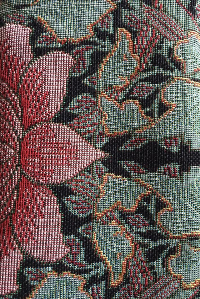 Etui à lunettes dans un mélange de toile tapissier à motif de feuilles et fleurs vert, rouge, noir et jaune.