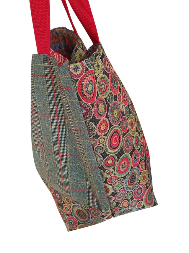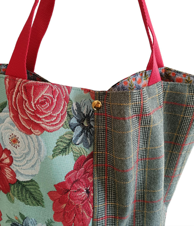 Grand cabas mélangeant deux tissus jacquard Gobelin et un lainage écossais.