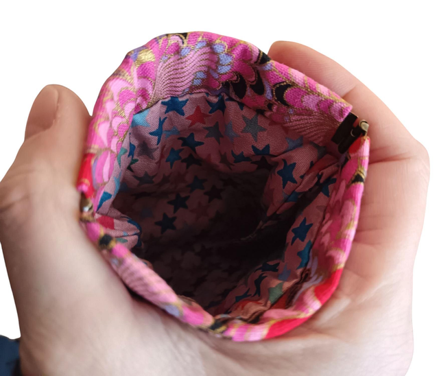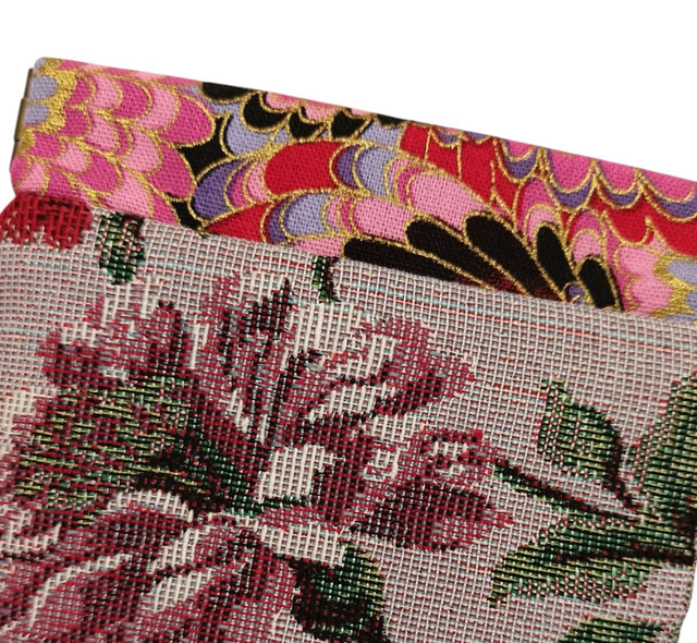 Réalisé dans un tissu à fleurs sur fond mauve et un tissu Japonais plumes de paon rose, rouge et noir.