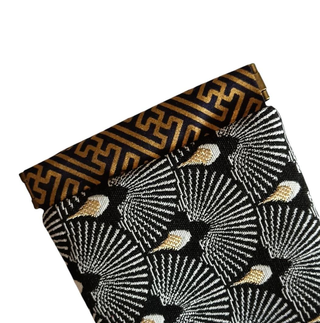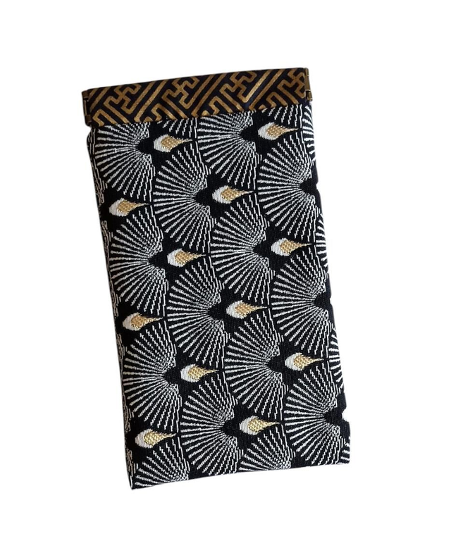 PS Cendrillon/ Etui à lunettes à cliquet / Etui à lunettes en tapisserie Plumes de paon noires et or et tissu Japonais.