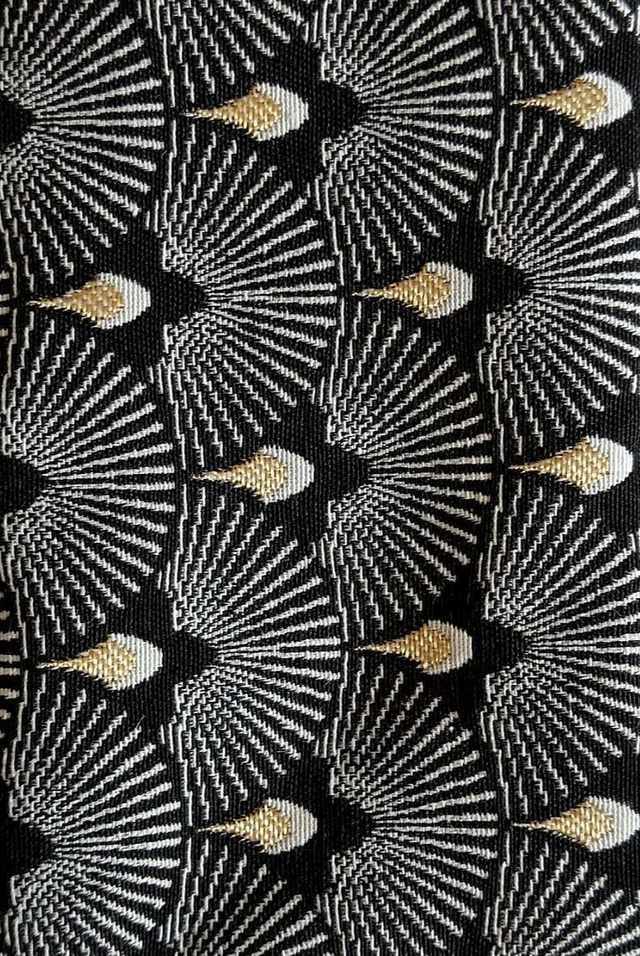 Un jacquard à motif de plumes de paon noir, bland et or et un tissu japonais noir.