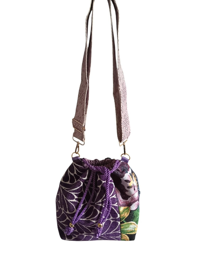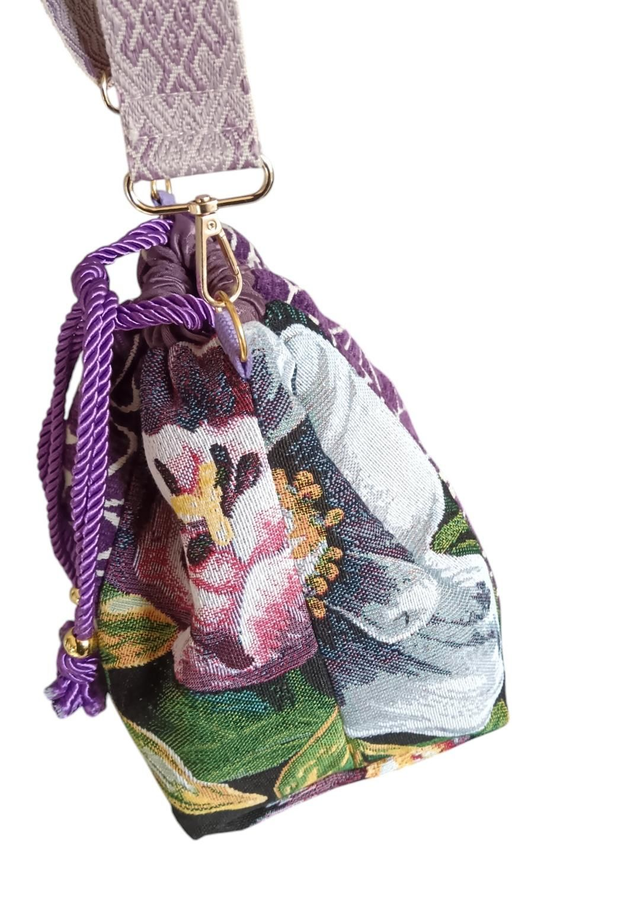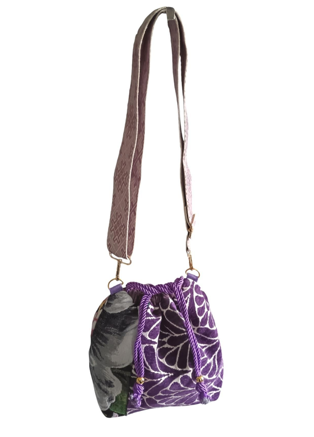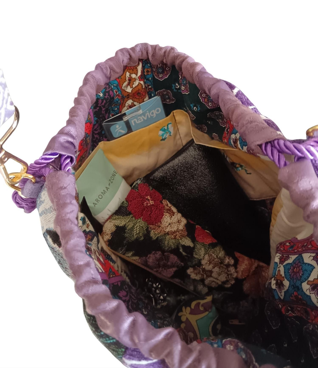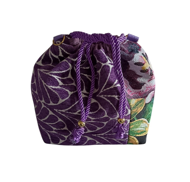 Sac bourse réalisé dans un mélange de deux toiles tapissier, un jacquard Gobelin à grosse fleurs et un jacquard velours violet et blanc.